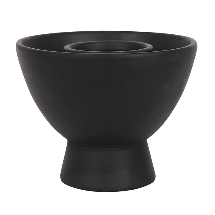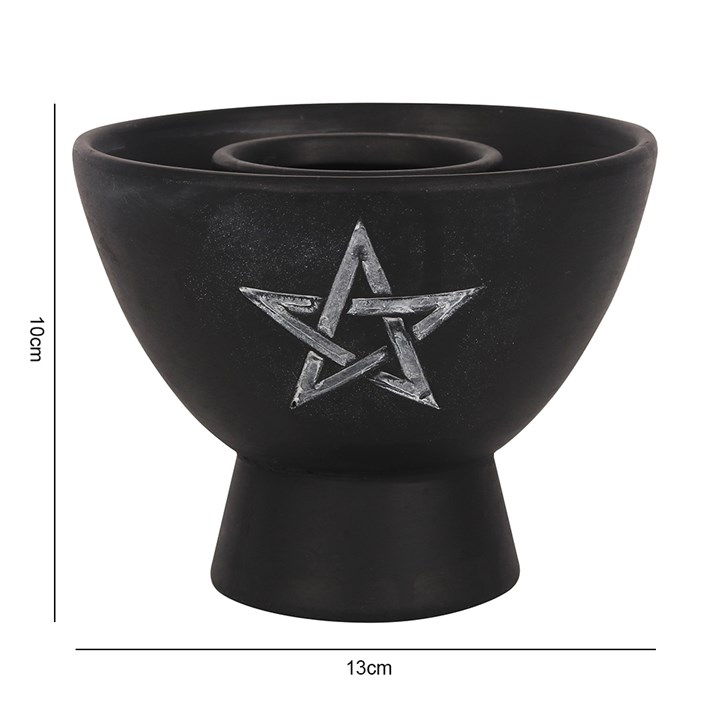 Used for burning herbs or smudge sticks this large black terracotta smudge bowl features a beautiful white pentagram design and has a 13cm diameter. Product Dimensions: H10. 5cm x W13cm x D13cm Packaged Dimensions: H14cm x W16cm x D16cm .