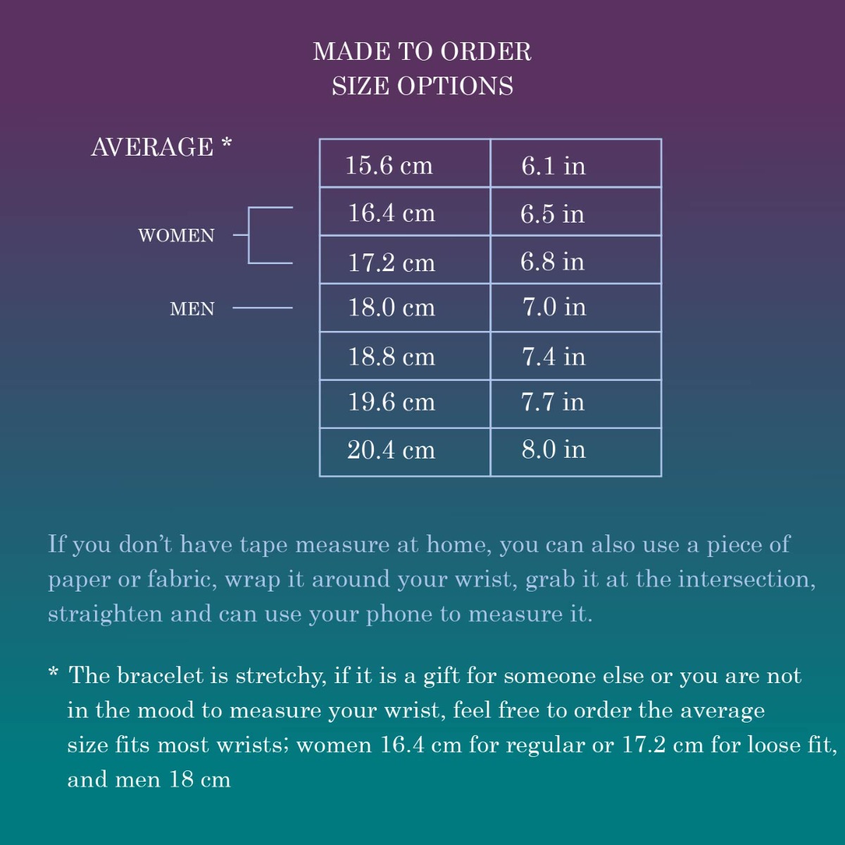 *** The length of the bracelet is based on the number of crystal beads it contains, however as the bead sizes can differ slightly (by 1mm), the bracelet length given in the table is based on the averaged bead size. Size 17. 2 cm/6. 7 inch would contain 23 beads and smaller or larger bracelets will each differ by 8mm (average bead size). The bracelet is stretchy so will fit most wrists, if you prefer to have the bracelets slightly loose, and your wrist measurement falls between two sizes, select the larger size.