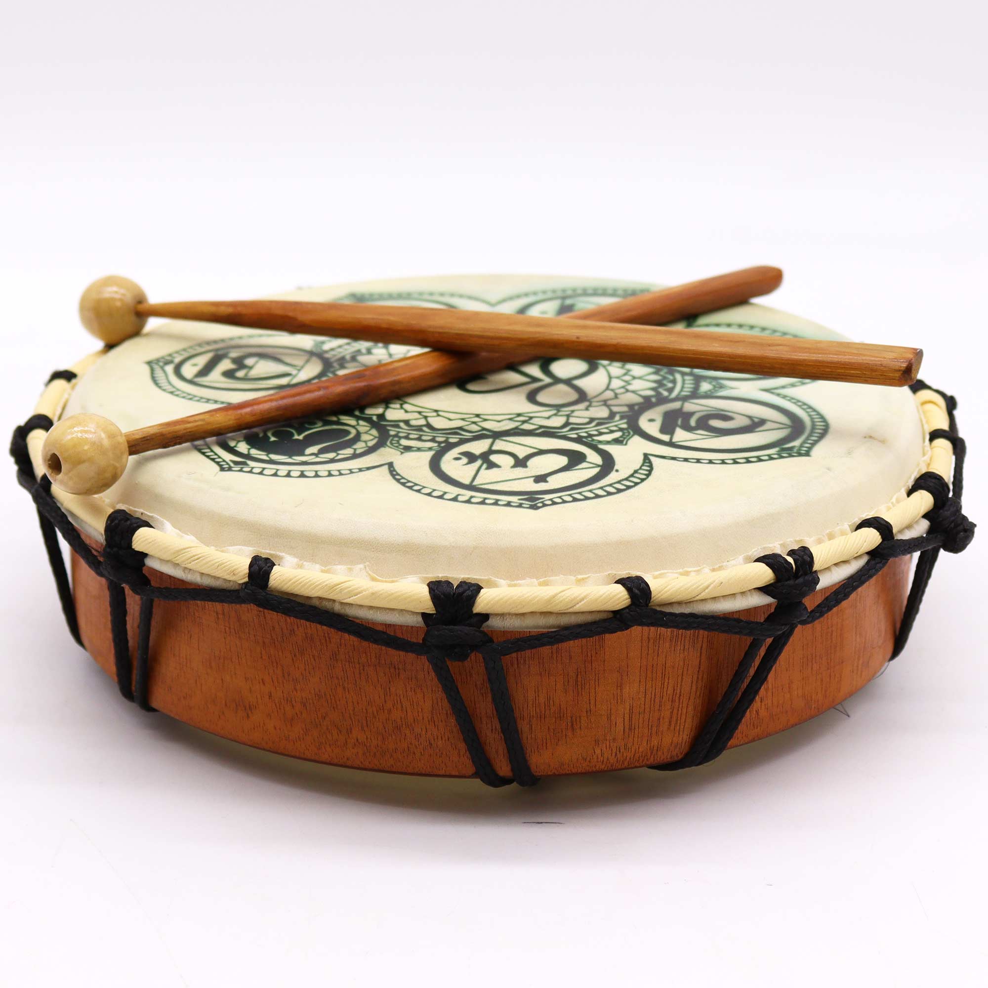 25cm Chakra Shamanic Drum with Sticks: Harmony in Every BeatChakra Shamanic Drum, a 25cm wonder that harmonises sight and sound. This captivating drum, complete with sticks, features a mesmerising Chakra design, inviting spiritual balance and tranquillity into your collection. ? Crafted from high-quality Suar wood ? Authentic goat skin for rich, resonant tones? Embellished with intricate Chakra symbols for spiritual resonanceUnlock the power of Chakra energy with this exquisite Shamanic Drum.