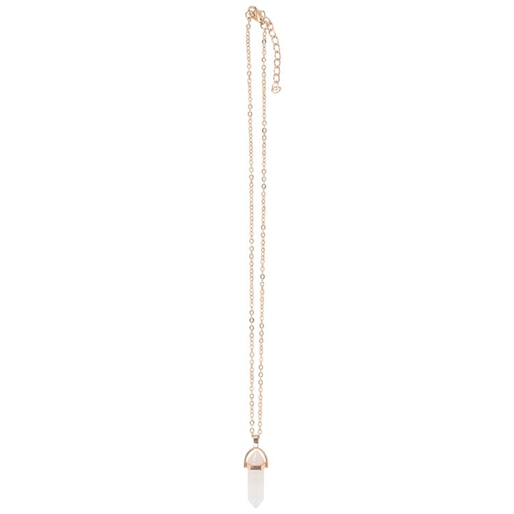 This lovely greeting card features a gold-tone necklace with semi-precious clear quartz crystal pendant to promote positive energy. 22cm chain with lobster clasp closure. Nickel-free stainless steel.