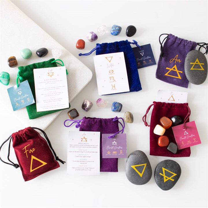 Aries, Leo and Sagittarius are signs ruled by the element of fire and are known to be bold, passionate and incredibly charming. This stunning set of 5 elemental tumblestones includes Black Obsidian for clarity, Yellow Aventurine for balance, Carnelian for energy, Hematite for protection and Red Jasper for comfort. Beautifully presented in a protective velvet drawstring bag with hang tag and informative insert card.