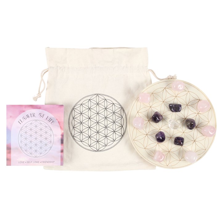 Practice the spiritual art of amplifying energies with this lovely crystal grid set. The Flower of Life is a geometric pattern widely recognised as a visual representation of the interwoven connection between all things. This set includes everything needed to arrange your own crystal grid for attracting love, self-love and friendship; 7 rose quartz tumblestones, 5 amethyst tumblestones, 1 clear quartz tumblestone, an engraved wooden grid and an instructional insert card all presented in a printed drawstring bag Product Dimensions: H1.