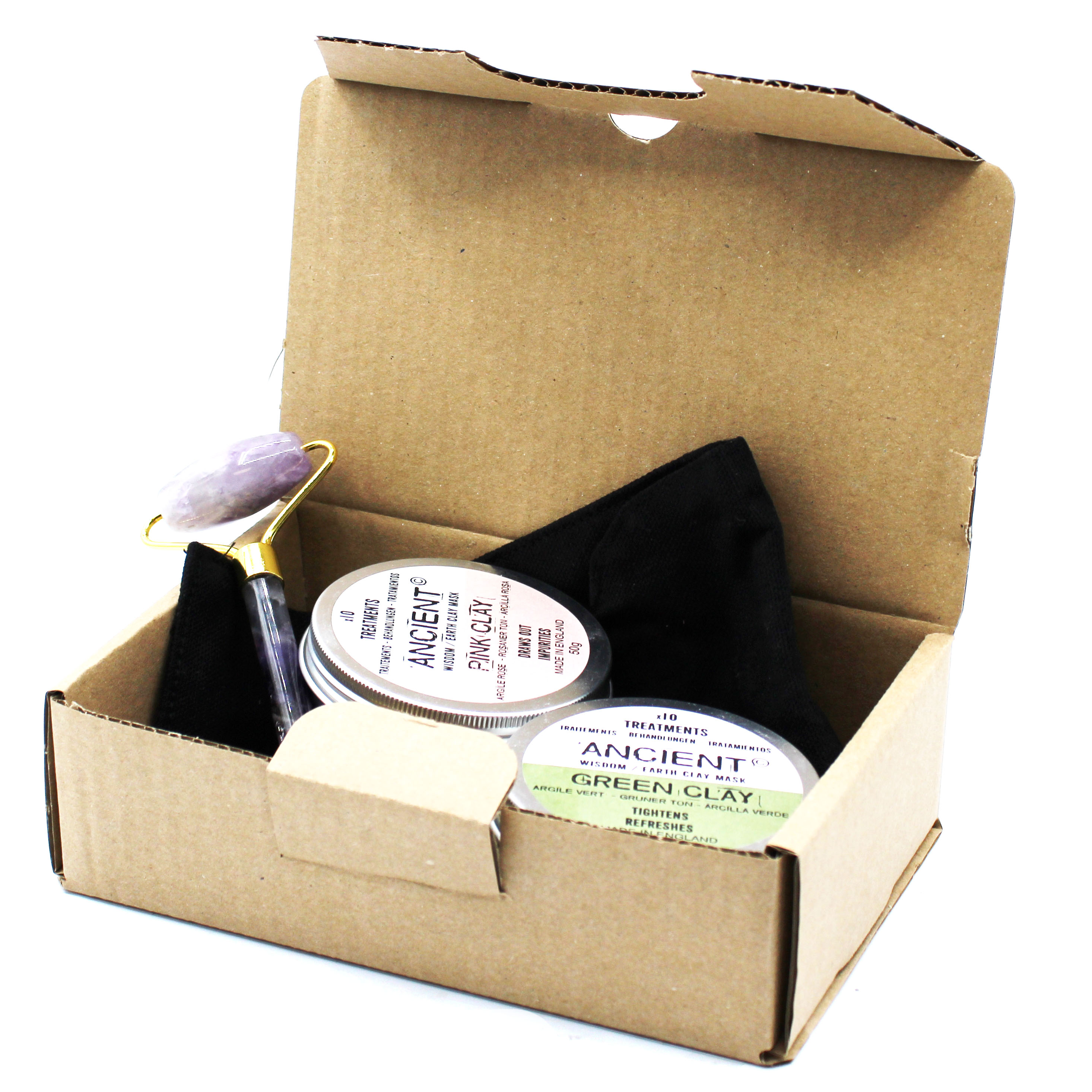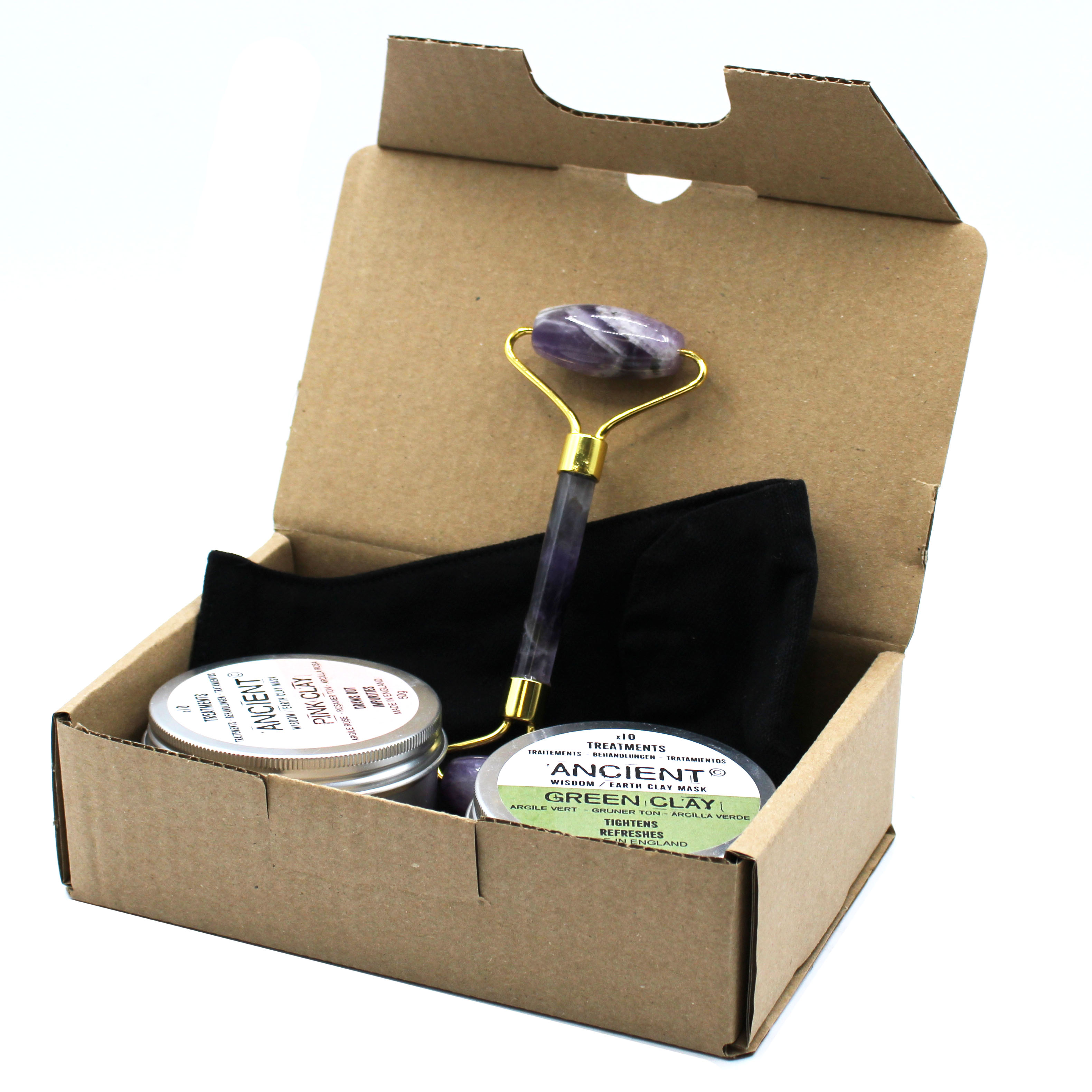 Preboxed, shrink wrapped and Labelled gift set,The box contains:1x GemFR-03 - Amethyst roller & pouch1x Green Clay1x Pink Clay.