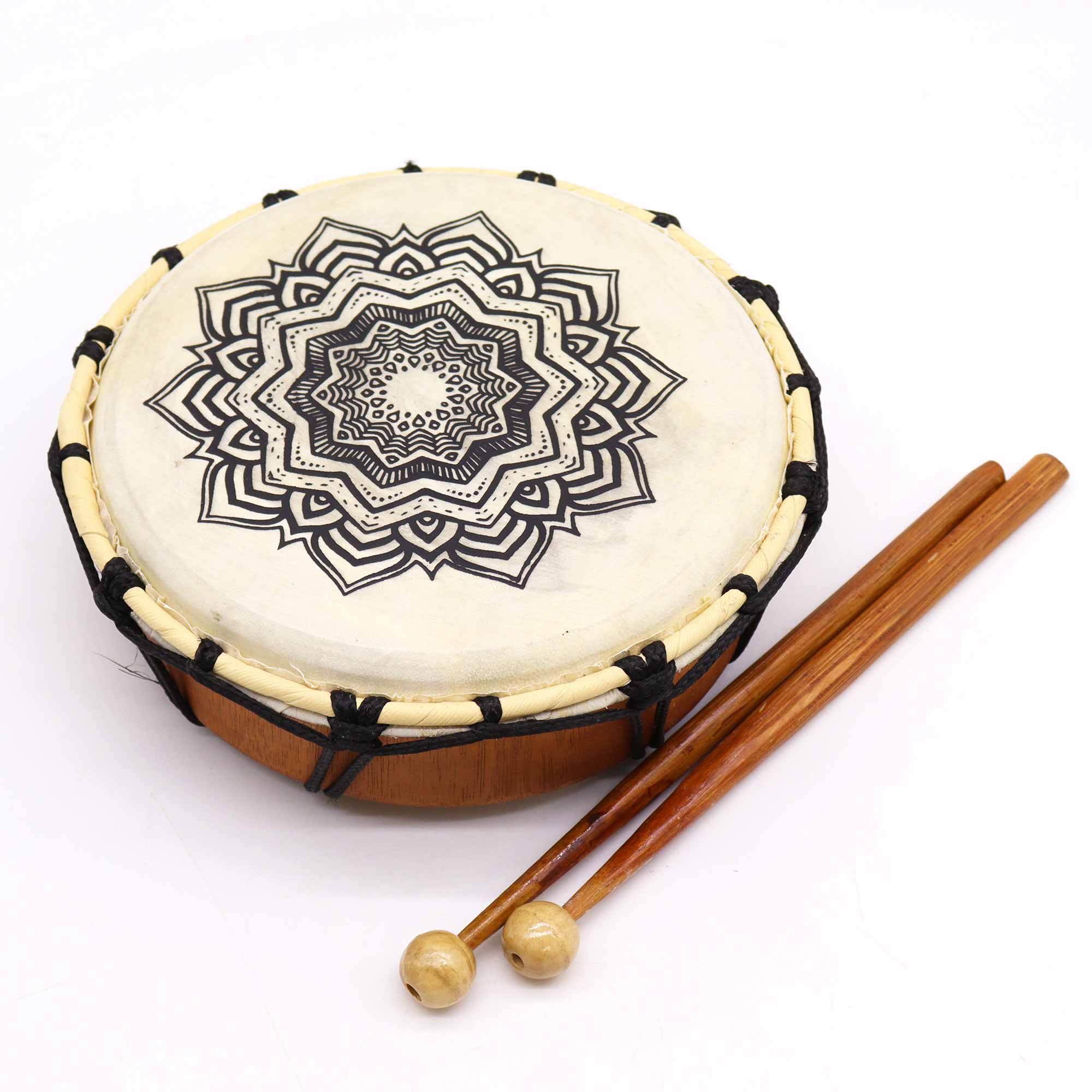 20cm Mandala Shamanic Drum with Sticks: Sacred Sounds in MiniatureMandala Shamanic Drum, is a compact marvel that delivers powerful, resonant rhythms. This 20cm drum, complete with sticks, carries the intricate beauty of the Mandala design, inviting a sense of serenity and spirituality into your collection. ? Crafted from high-quality Suar wood ? Authentic goat skin for rich, resonant tones? Perfect for spiritual and meditation practicesDiscover the allure of Mandala artistry in a musical form.