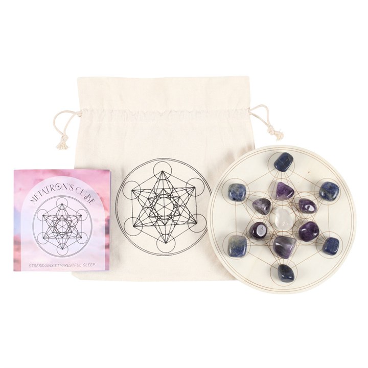 Practice the spiritual art of amplifying energies with this lovely crystal grid set. Metatron's Cube is a geometric pattern widely recognised as a visual representation of the connection between heaven and earth. This set includes everything needed to arrange your own crystal grid for easing stress, relieving anxiety and aiding in restful sleep; 6 sodalite tumblestones, 6 amethyst tumblestones, 1 clear quartz tumblestone, an engraved wooden grid and an instructional insert card all presented in a printed drawstring bag.