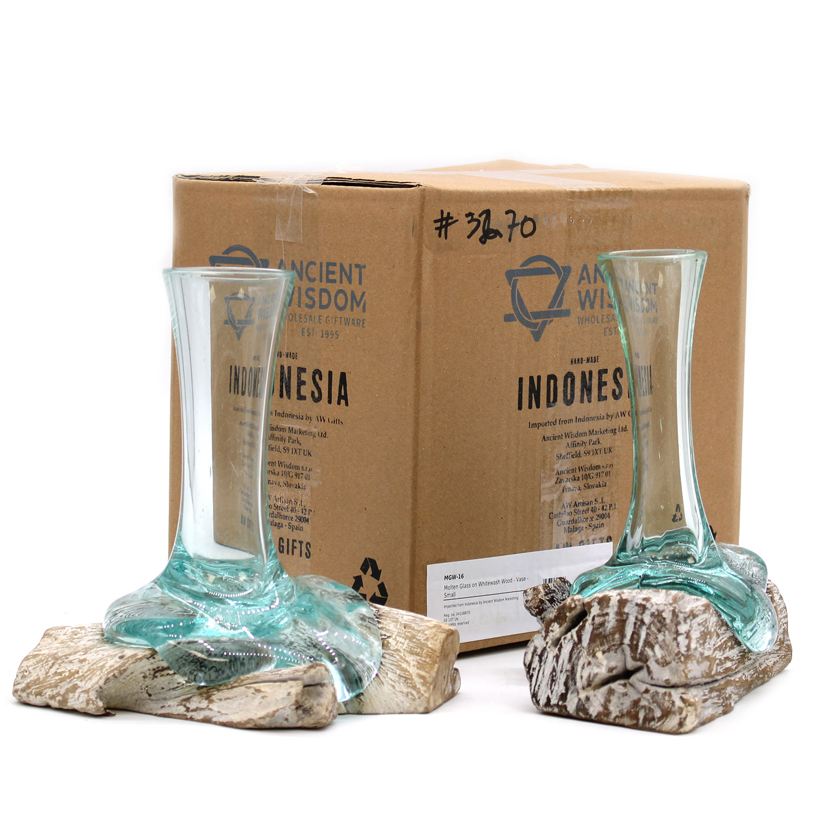 They are crafted by hand in Bali from recycled glass and Balinese Gamal wood. This stunning, molten art glass vase brings the best of two worlds together: natural and man-made; earthy and chic; practical and spiritual. They can be used for house plants, zen gardens or floating candles.