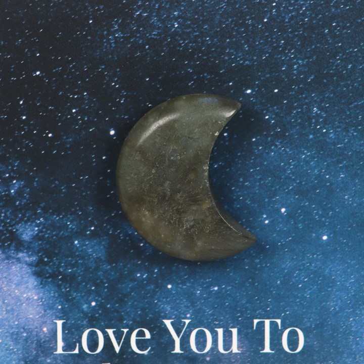 Give the gift of magic with this meaningful crystal greeting card. Includes a small labradorite crystal crescent moon attached to a greeting card with 'Love you to the moon and back��� text. Labradorite is a spiritual stone used for strength, intuition and protection.