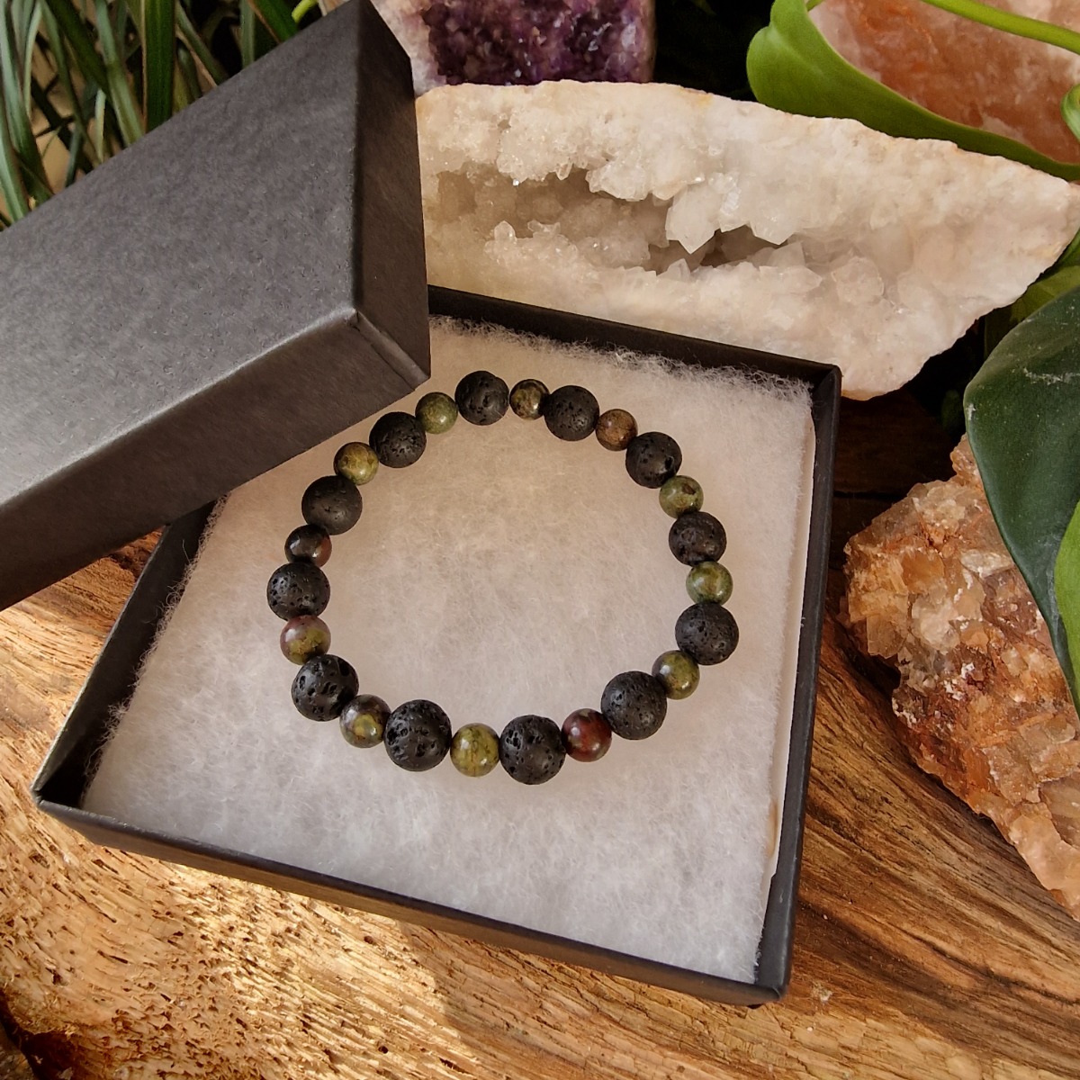 | Dimensions | 8mm Lava Stone, 6mm Dragon's Blood Stone |
