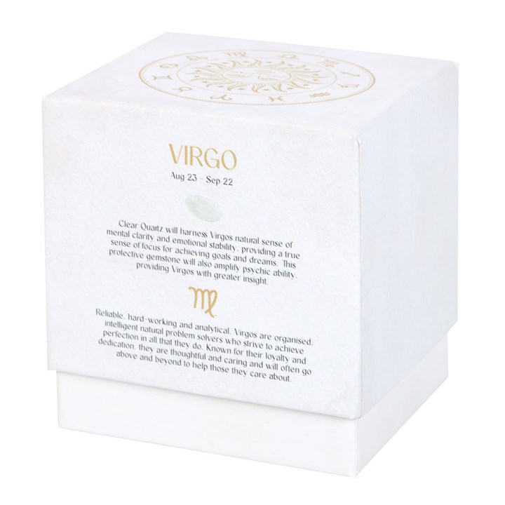 Bring power and positivity to individuals born between August 23 and September 22 with this stunning Virgo zodiac candle. A Sandalwood & Patchouli fragrance is accented by a sprinkling of clear quartz crystal chips that can later be reused for a multitude of spiritual purposes. Clear quartz will harness a Virgo's natural sense of mental clarity and emotional stability, providing a true sense of focus for achieving goals and dreams.