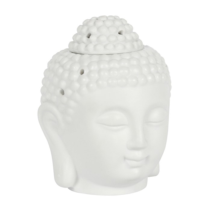 A matte white Buddha head oil burner. This item can also be used as a wax melt burner however it is advisable to consider the size and depth of the bowl when adding wax to ensure it will not overrun the edges when melted. Product Dimensions: H13cm x W10.