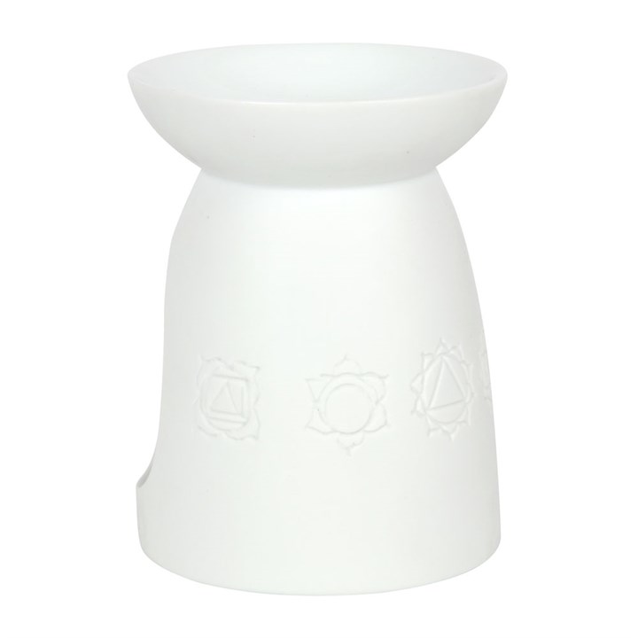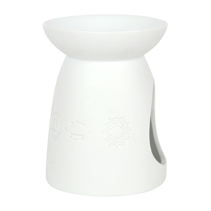 Timeless and elegant, this matte white oil burner features a subtle Seven Chakras design which is softly illuminated when a lit tealight candle is placed inside. Use with your favourite fragrance oils or wax melts to add beautiful scents to your home. Product Dimensions: H12.
